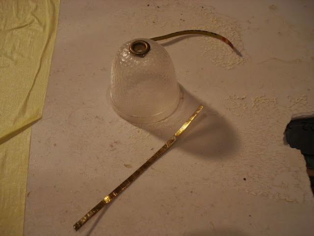 następnie z opakowania po cukierku odciąłem rant i wywierciłem otwór w który został wklejony nit, całość obkleiłem blaszką / alternatywnie aluminiowa taśma klejąca i klosz gotowy.